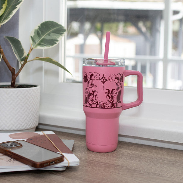 Stay refreshed all day with our 32 oz Insulated Tumbler with Straw featuring beautiful Indigenous art. Each tumbler is crafted from high-quality 304 stainless steel with a double-wall design, keeping your drinks hot or cold for hours. The ergonomic handle makes it easy to carry, and the BPA-free, FDA-compliant materials ensure safe use. Finished with a captivating screen print design, this tumbler is packaged in a vibrant gift box, making it a stylish and thoughtful choice for daily hydration or gifting.