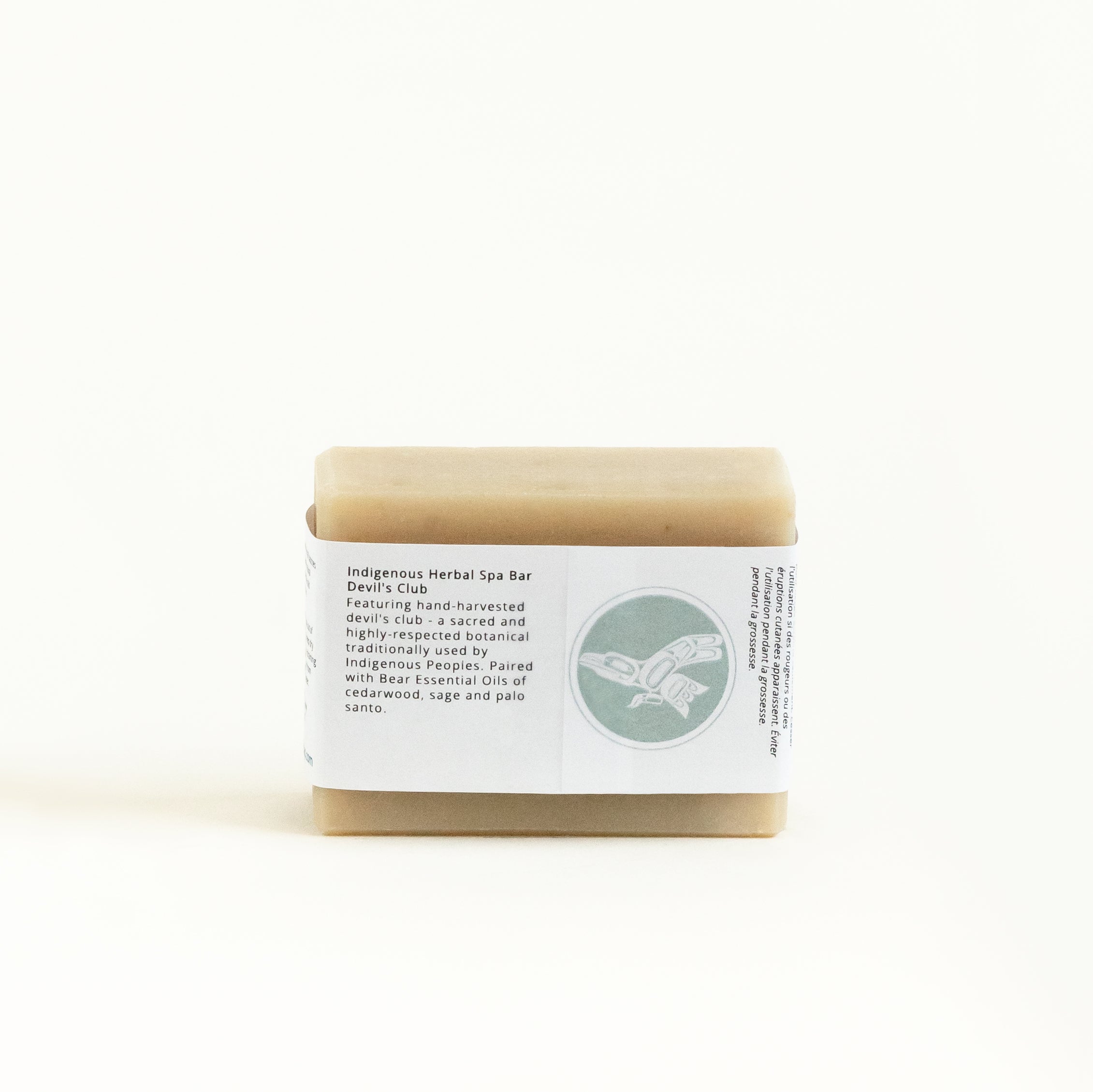 Many Haida stories speak about Devil's Club a wild botanical highly respected for its medicinal and spiritual powers. Blended with devil’s club root, cedar, and palo santo, this soap is formulated with natural ingredients to help relieve dry, tired skin.