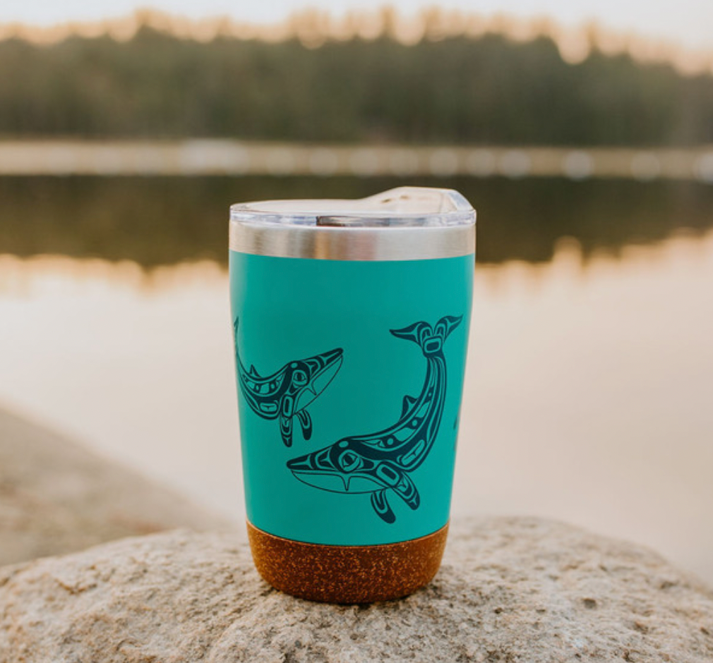 Versatile and designed to perform, Native Northwest Cork Base Travel Mugs feature a high-quality food-grade 304 stainless steel interior, a double wall with BPA-free push-on lid, and a stylish cork base that prevents scratching on different surfaces. These stylish travel mugs are great for temperature retention and can keep drinks both hot and cold for hours. Comes in a colour box with artist and product information.