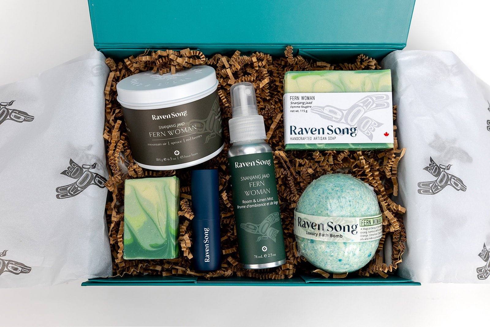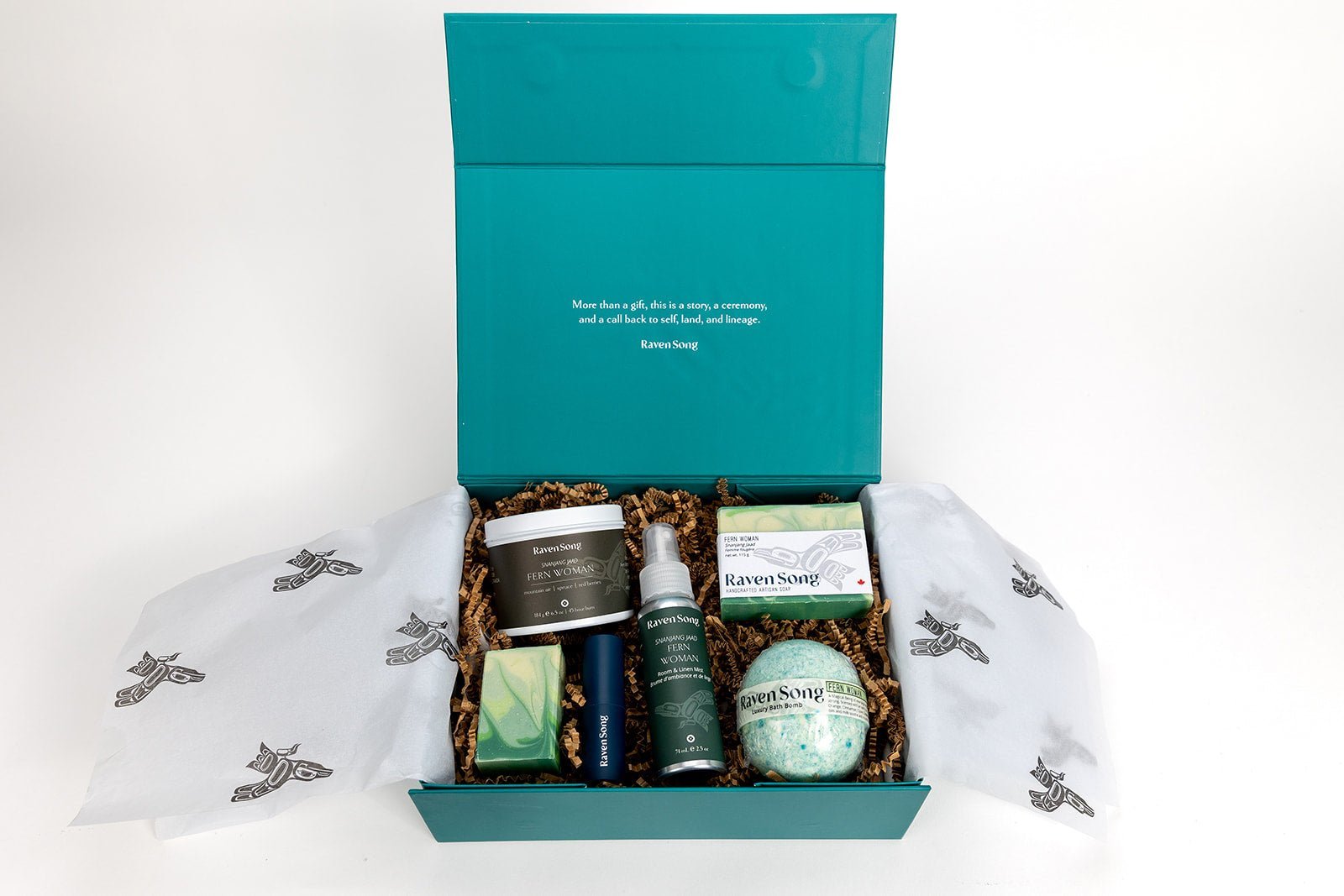 Packaged in our gorgeous custom RavenSong gift box featuring embossed Raven artwork, magnetic closure, and Raven art tissue paper.
